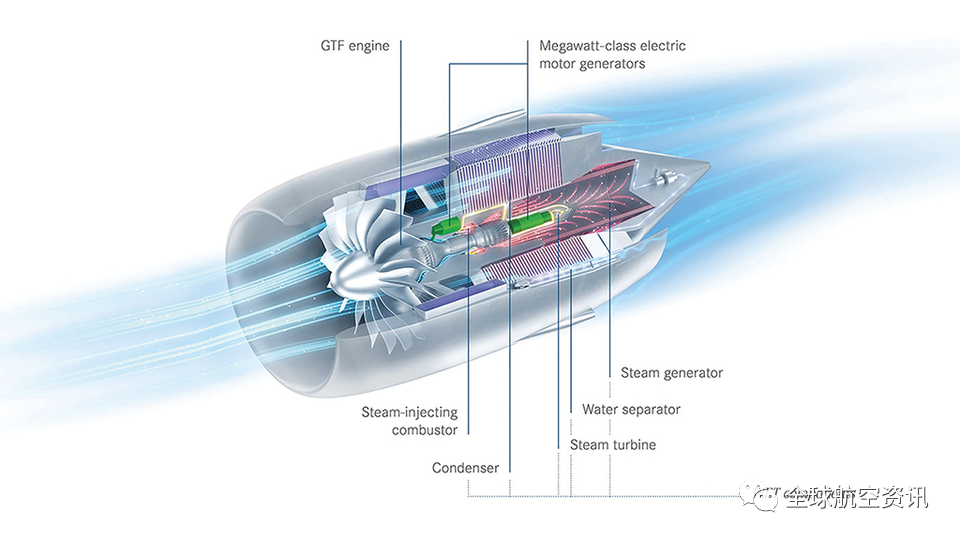 在亞音速領(lǐng)域,空客公司還與普惠公司和MTU航空發(fā)動機公司合作,參與歐洲“清潔航空”研究計劃下的另一個先進(jìn)推進(jìn)項目Switch。Switch的目標(biāo)是在21世紀(jì)30年代中期投入使用,目標(biāo)是減少25%的二氧化碳排放,減少80%的氮氧化物排放,并減少不明原因的尾跡排放。在WET概念下,從廢氣中收集水,并使用熱交換器將水蒸發(fā)成蒸汽。蒸汽被注入燃燒室,從而提高了燃料效率。